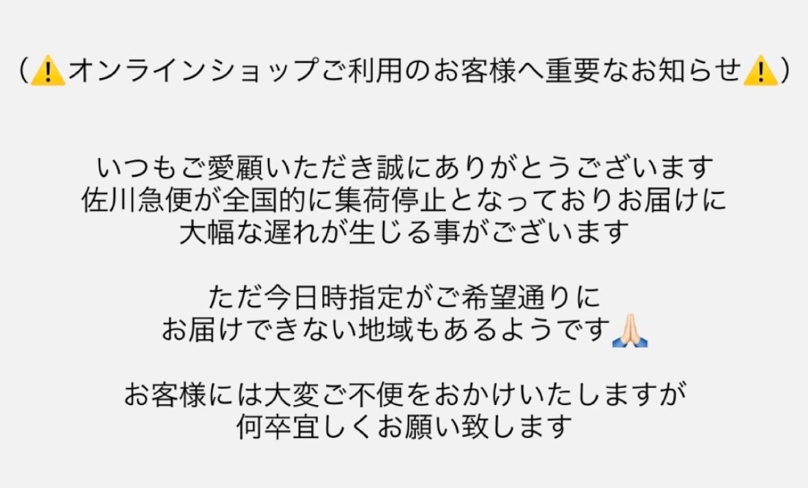 12/5現在、佐川急便にて大幅な配送遅延が生じております。